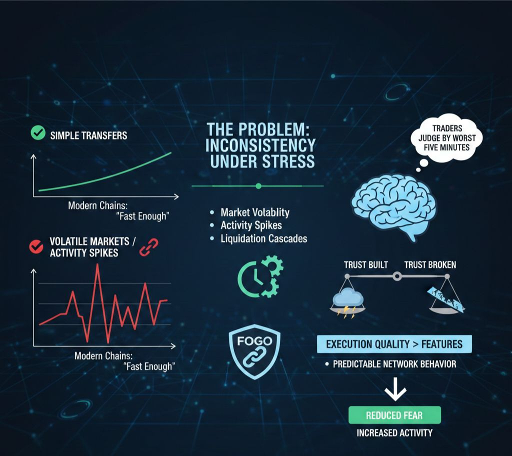 The core problem Fogo is addressing in this cycle is not raw slowness. Most modern chains are already “fast enough” for simple transfers. The real issue is inconsistency under stress. When markets get volatile, when activity spikes, or when liquidations cascade, networks reveal their weakest moments. Traders don’t judge a chain by its best-case performance. They judge it by its worst five minutes. That’s where trust is either built or broken. Fogo’s thesis is that crypto has matured to the point where execution quality matters as much as features. If users can’t predict how the network behaves during chaos, they will price in fear, and fear reduces activity.