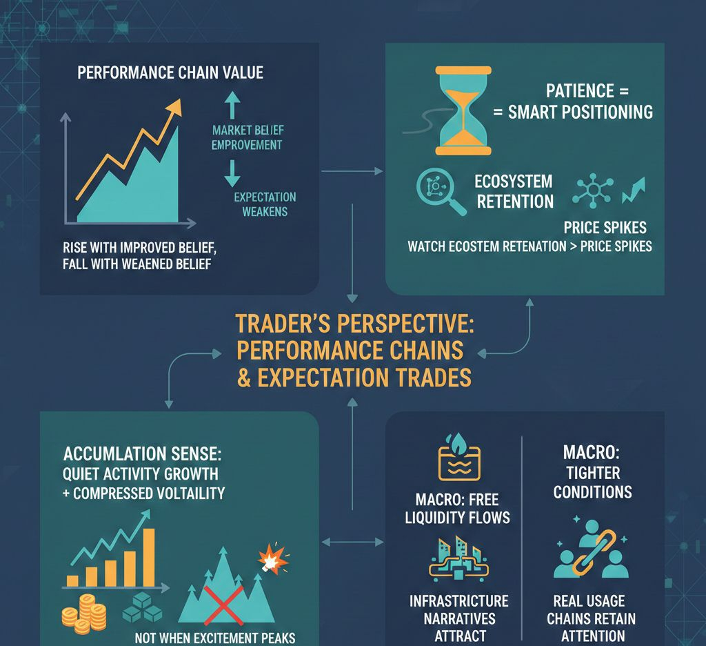 From a trader’s perspective, performance chains behave like expectation trades. They rise when the market believes the experience will improve and fall when that belief weakens. Smart positioning usually comes from patience. Watching ecosystem retention matters more than watching price spikes. Accumulation tends to make sense when activity grows quietly while volatility compresses, not when excitement peaks. Macro conditions also play a role. When liquidity flows freely, infrastructure narratives attract attention. When conditions tighten, only chains with real usage keep that attention.