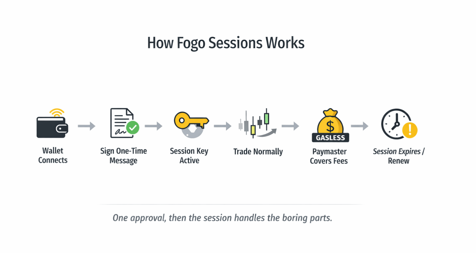 Fogo Sessions is a way to stop the “sign, sign, sign” loop. You connect once, approve a session once, and then you can keep using the app without being dragged back into approval popups for every single action.