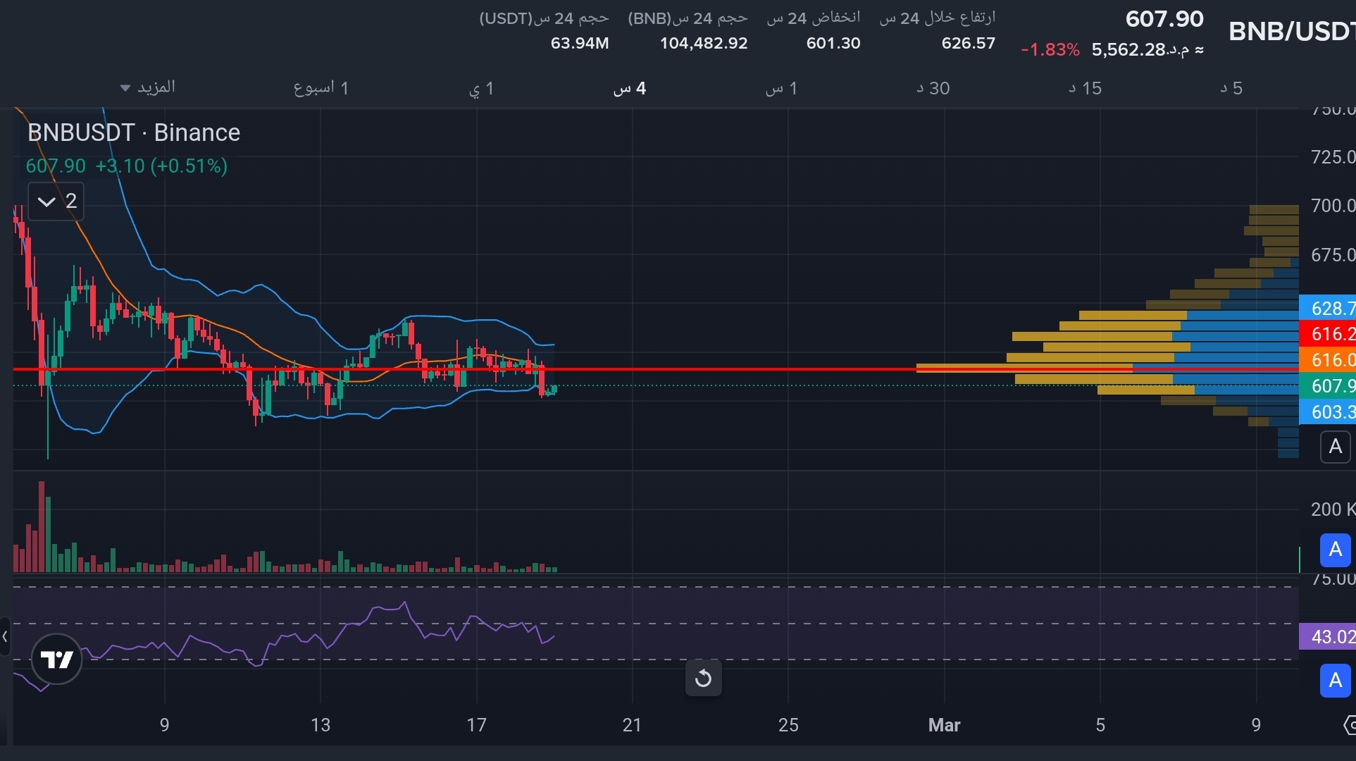 Abbiamo osservato un raggruppamento professionale sopra i livelli di 604$, con segnali di rimbalzo forti sull'indice di forza relativa (RSI). Il prezzo ora preme sulle linee EMA in attesa di una scintilla di partenza. Chi perderà questa opportunità, potrebbe svegliarsi domani per vedere il prezzo a livelli che non avrebbe mai immaginato.
