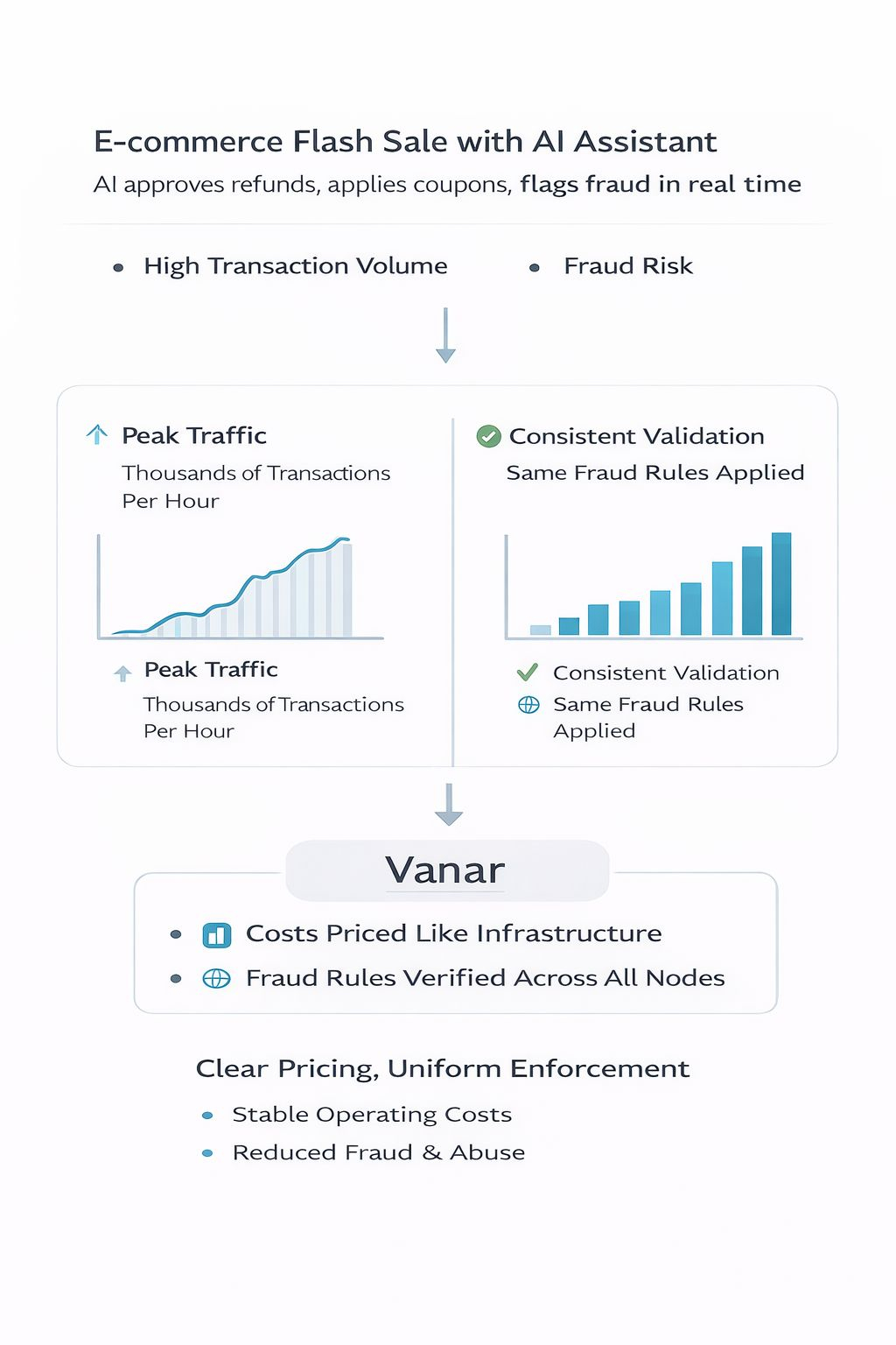 I explain VANRY to non crypto people with a scenario from the kind of workflow that actually breaks when incentives are vague. Imagine a mid-sized e-commerce platform in Germany running a weekend flash sale and using an AI assistant to approve refunds, apply coupons, and flag fraud in real time. At peak traffic, the AI is making thousands of calls per hour to check eligibility rules, write decisions to an audit log, and trigger payouts. If costs are not metered cleanly, the system either gets abused by spammy requests or finance shuts it down because the bill becomes unpredictable. If validators cannot enforce the same semantic rules consistently, the same customer can be approved on one path and rejected on another, which turns into chargebacks, disputes, and support chaos. Vanar’s value proposition is that this workflow can be priced and governed like infrastructure: each decision has a measurable cost, each state change leaves a trace, and the validator layer is accountable for enforcing the same policy logic so operations can scale automation without losing control of spend, behavior, or auditability.