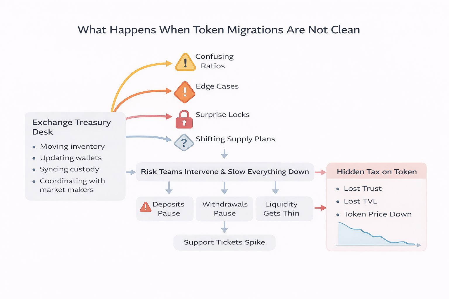 I have seen what happens when migrations are not clean. Picture a mid-sized exchange treasury desk during the changeover. They are moving inventory, updating wallets, syncing custody, coordinating with market makers, and trying to keep spreads tight. If the swap has confusing ratios, rounding edge cases, surprise locks, or a supply plan that shifts midstream, risk teams step in and slow everything down. Deposits pause. Withdrawals pause. Liquidity gets thin. Support tickets spike. The token ends up paying a hidden tax in the form of distrust.