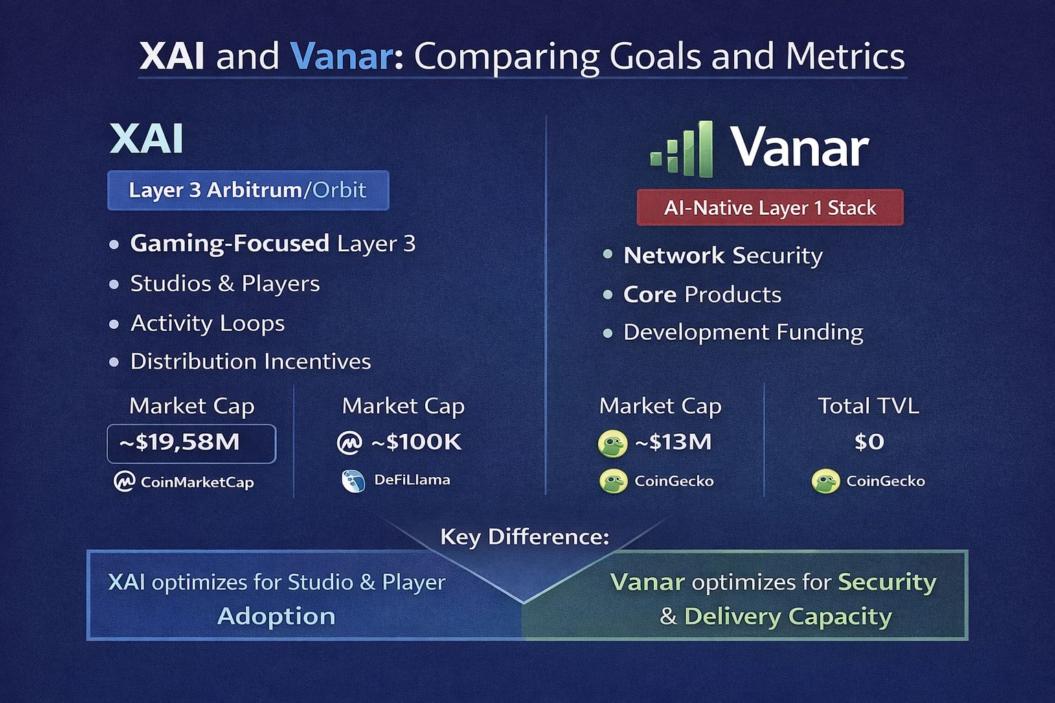 XAI and VANRY are solving different parts of the stack, and their numbers reflect that. XAI is explicitly a gaming-focused Layer 3 on Arbitrum/Orbit, so its token model and incentives are built to pull studios, players, and in-game economies onto a purpose-built execution environment, with distribution pressure naturally leaning toward ecosystem onboarding and activity loops. Vanar positions VANRY as an AI-native Layer 1 stack, so the emissions logic reads more like a budget for keeping the base layer secure and shipping the core product layers, not just subsidizing usage. On the scoreboard metrics, CoinMarketCap currently shows $VANRY around a ~$13M market cap and XAI around a ~$20M market cap, so $XAI is being valued higher despite being narrower in vertical focus. On TVL, DeFiLlama shows Xai chain TVL roughly ~$100k, while CoinGecko’s chain page for Vanar Chain shows TVL at $0, which is a reminder that TVL mostly measures DeFi liquidity, not whether an infra narrative is “real.” The practical takeaway is that XAI’s model is optimized for distribution-driven adoption in gaming, while Vanar’s model is trying to justify emissions as security + delivery capacity so the network can survive the moment incentives stop doing the heavy lifting.