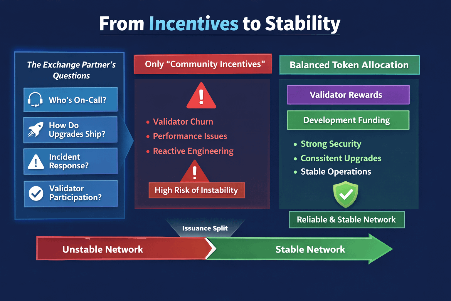 I think about it like the week an exchange partner asked us for an uptime plan before they even talked marketing. They wanted to know who was on-call, how upgrades ship, what happens during an incident, and whether validator participation stays healthy when markets get quiet. If the only serious budget in the token model is “community incentives,” you can feel the risk immediately: validators churn, performance degrades, and the engineering team becomes reactive because there is no consistent capacity for audits, tooling, and fixes. But when issuance is explicitly split between validator rewards and development, you can answer those questions with something real. You can fund security, ship patches without drama, and keep the network stable while growth programs run on top, not instead of the foundation.