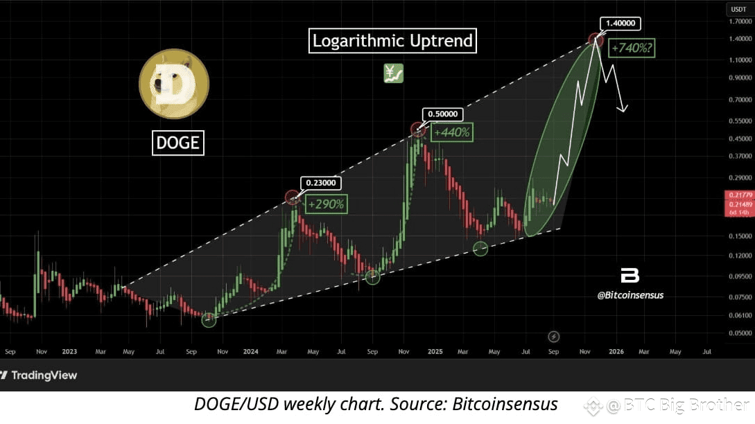 Nel grafico settimanale, Dogecoin viene scambiato all'interno di un pattern megafono rialzista, rimbalzando dal suo minimo di $0.15 di giugno. Gli analisti notano che ogni rally all'interno di questa formazione ha storicamente superato l'ultimo.