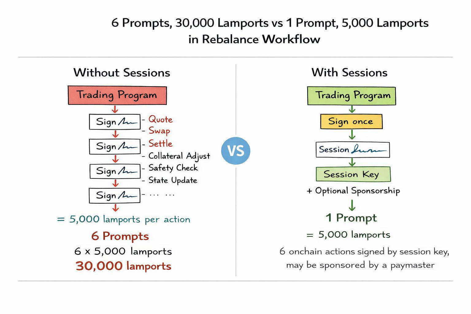 A simple way to quantify the difference is to count prompts and base fees in a typical multi step action. In the rebalance workflow I reviewed, the user path naturally breaks into six onchain actions: quote, swap, settle, collateral adjust, safety check, state update. On a Solana style fee model, a basic transaction with one signature is priced at 5,000 lamports, so six signed steps is 30,000 lamports in base fees before any prioritization tip. With FOGO Sessions, the user signs once to create the session, and the subsequent actions can be signed by the session key and even sponsored by a paymaster if the sponsor’s constraints allow it. In human terms, it is the difference between six interruptions and one clean “yes, for this, within these limits, for this long.”