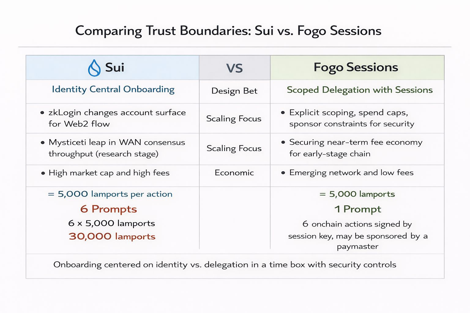It is useful to compare this posture with $SUI because the design bets are different. Sui pushes UX by changing the account surface with zkLogin, so onboarding can feel closer to a Web2 login flow. Mysticeti research reports extremely fast consensus commits and very high throughput in WAN experiments and notes integration into Sui, but that is research measurement, not a promise of day to day mainnet behavior. Pricing also reflects lifecycle differences, with Sui carrying a much larger market cap while $FOGO is priced like an earlier network. The contrast is not “who is faster.” It is where each system puts the trust boundary: identity centric onboarding versus explicit, time boxed delegation with sponsor constraints.