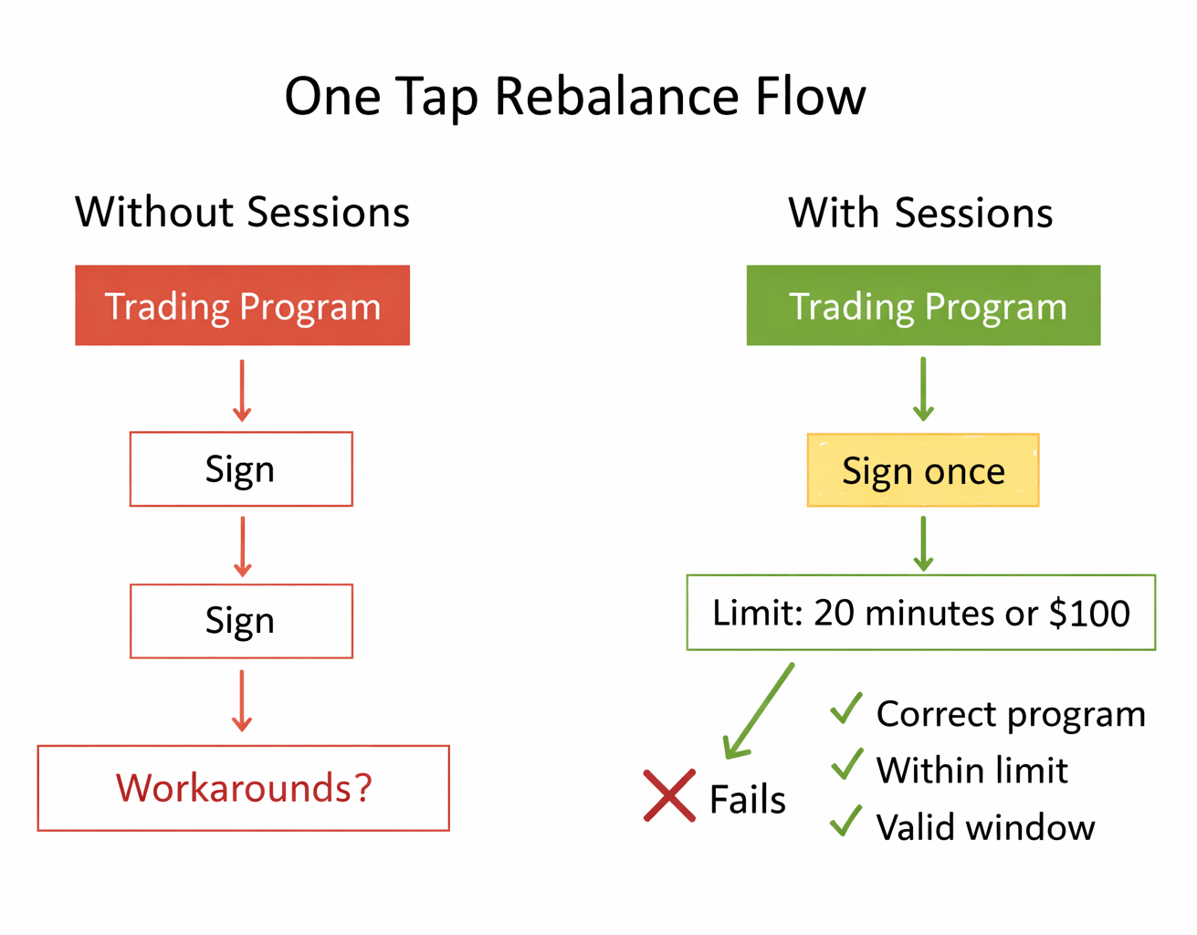 Here is where it got real for me. We were prototyping a one tap rebalance flow. Without scoped delegation, the user either signs repeatedly or you end up building workarounds that behave like custody, just hidden behind “convenience.” With FOGO Sessions, the user signs once to allow only a specific trading program, capped to a fixed spend limit, for a short window like 20 minutes. If a bug tries a different program, exceeds the cap, or runs after expiry, it fails onchain and the permission simply stops being valid.