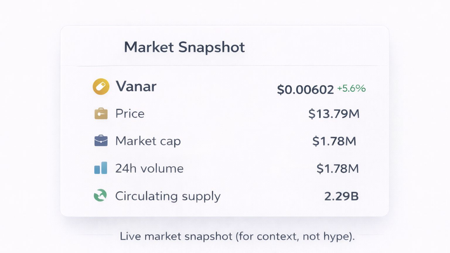 For a quick snapshot of market visibility, Binance’s price page currently lists VANRY at $0.00602, with a market cap of $13.79M, $1.78M 24-hour volume, and 2.29B circulating supply.