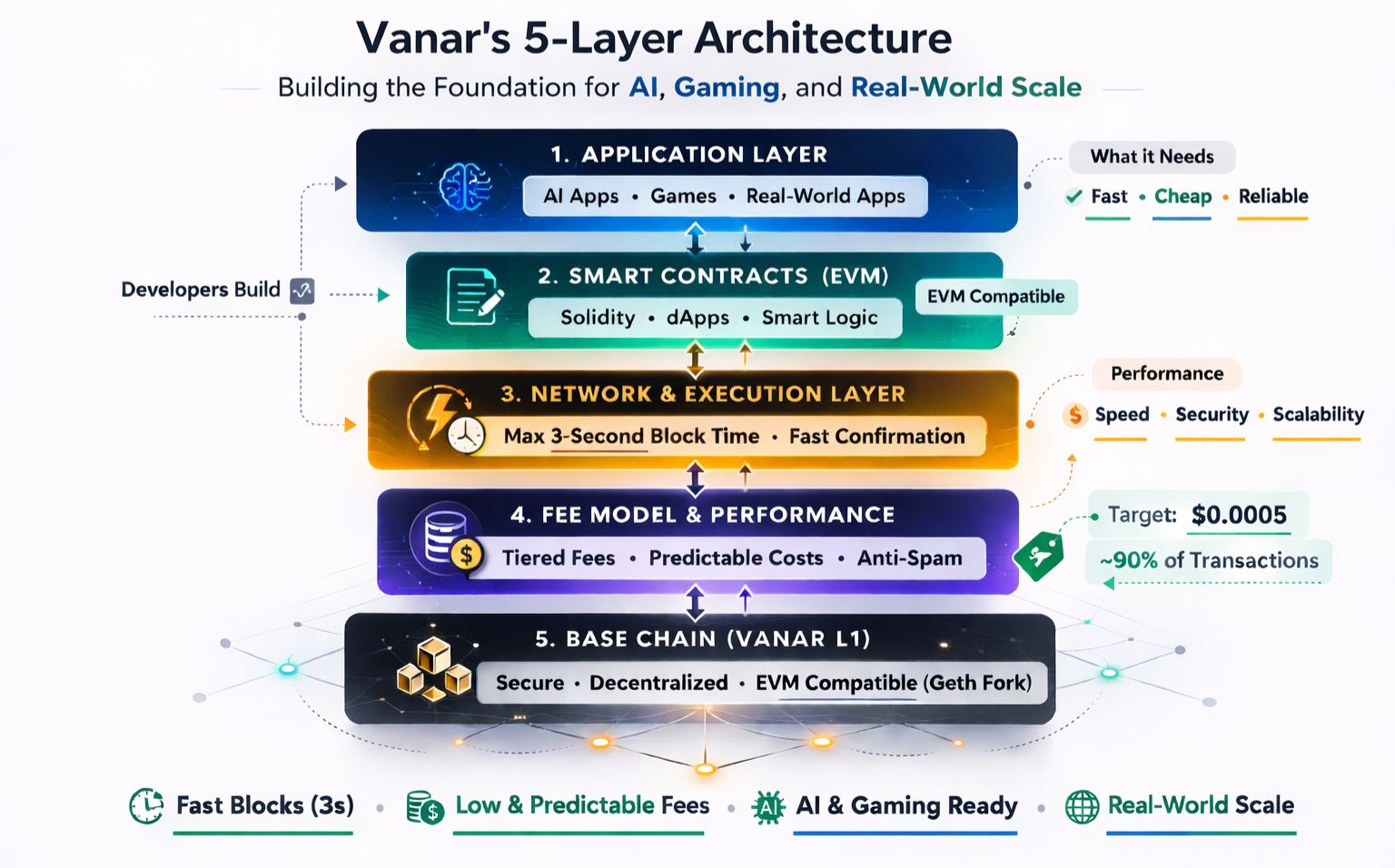 Vanar Chain positions itself as a modular Layer 1 built for AI-era apps, and it leans hard on a 5-layer architecture idea. Their site says the five layers are meant to turn Web3 apps from simple smart contracts into “intelligent systems,” basically apps that can learn, adapt, and run more complex logic by default.
