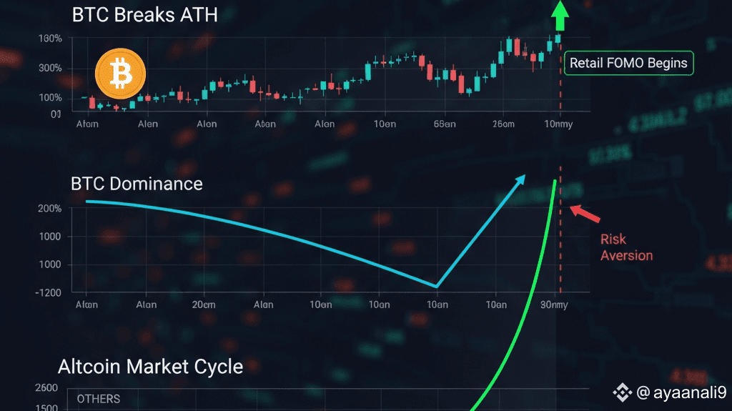 Non è qualcosa che accade durante la prima o la fase centrale del ciclo in cui Bitcoin prende il centro della scena. È la fase finale. Questo è logico perché gli investitori al dettaglio iniziano a prestare attenzione solo quando $BTC rompe il suo ATH precedente e l'attenzione dei media esplode. Questo "costringe" a cercare monete economiche che possono trasformarli in milionari intraday.