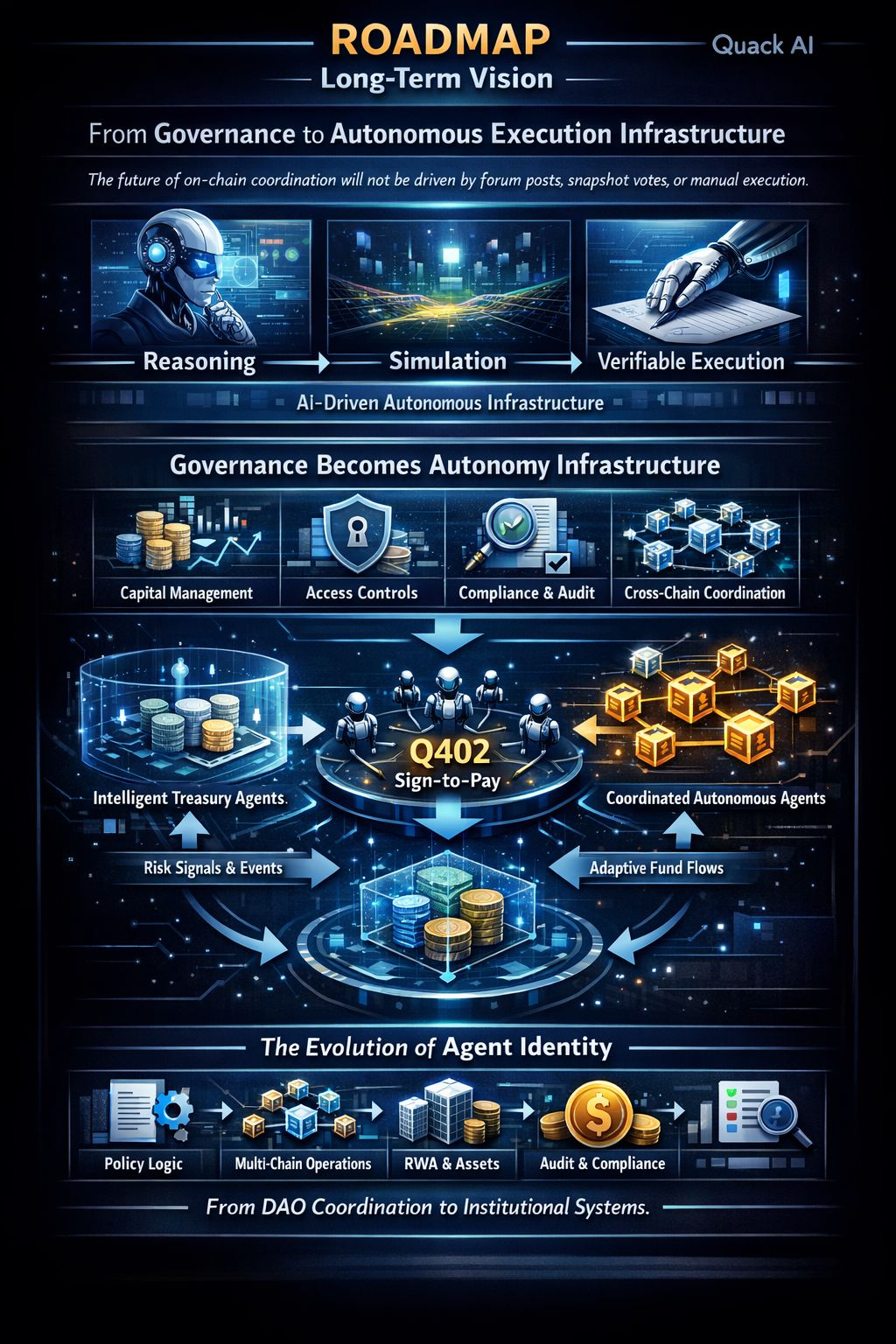 Tujuan utamanya adalah menciptakan Identitas Agen yang canggih—representasi digital institusi yang beroperasi dengan logika keputusan dan batasan yurisdiksi yang jelas. Quack AI tidak hanya untuk eksperimen DAO kecil, tetapi dirancang untuk fase institusional blockchain di mana eksekusi cerdas, patuh regulasi, dan transparan berjalan di latar belakang (invisible) sebagai fondasi sistem on-chain generasi berikutnya. #Q $Q