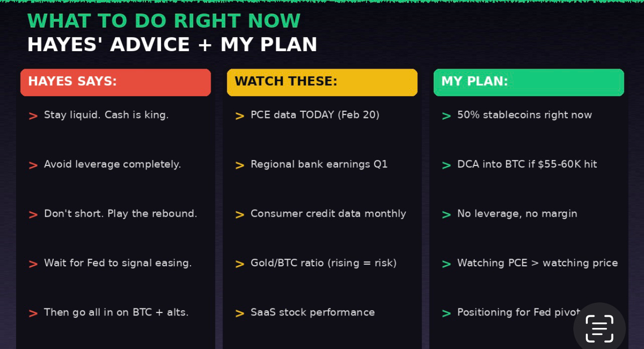 Il mio approccio: circa il 50% di stablecoin in questo momento. Posizioni BTC esistenti mantenute senza leverage, stop-loss sotto $55K. Osservando i dati sull'inflazione PCE oggi (20 febbraio) più da vicino rispetto al grafico di Bitcoin. Se il PCE arriva caldo, ritarda i tagli ai tassi e prolunga il dolore. Se il PCE arriva fresco, accelera il cronoprogramma per l'azione della Fed.