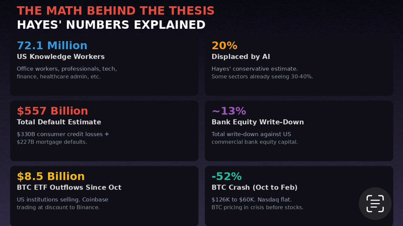 I $557 miliardi in perdite totali. Hayes arriva a questo prendendo l'esposizione totale del credito al consumo e delle ipoteche detenuta dalle banche e applicando tassi di perdita proporzionali al suo modello di spostamento. La matematica è direzionalmente corretta, anche se la perdita effettiva potrebbe variare significativamente. Nel 2008, la perdita data dal default sui mutui era mediamente intorno al 40-50%. Su carte di credito, era più vicino al 60-70%. Se lo spostamento dell'IA avviene in modo più graduale (in 3-5 anni invece di 12-18 mesi), le perdite sarebbero distribuite e il sistema bancario potrebbe assorbirne di più.
