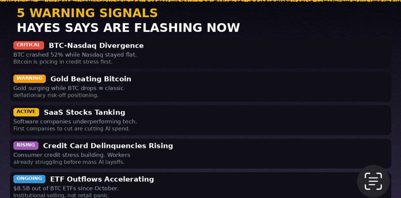 Questo è il motivo per cui Bitcoin è crollato del 52% dal suo massimo storico di ottobre di $126,000 mentre il Nasdaq 100 è rimasto relativamente piatto. Le azioni prezzano le future entrate. Bitcoin prezza la liquidità attuale. E in questo momento, la liquidità in dollari si sta contraendo silenziosamente in modi che non si sono ancora mostrati nei prezzi delle azioni. Hayes crede che Bitcoin sia il canarino nella miniera di carbone. Sta già suonando l'allerta su una crisi di credito che i mercati tradizionali non hanno ancora prezzato.