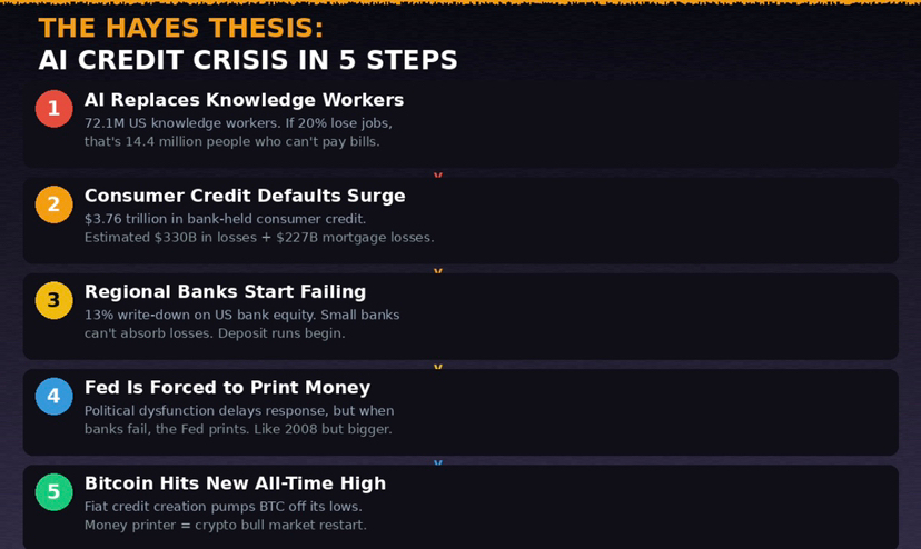 Arthur Hayes ha appena scritto il saggio macroeconomico più importante nel crypto quest'anno. La sua tesi: Bitcoin è crollato perché sta facendo esattamente ciò per cui è stato progettato. Segnalare una crisi di credito imminente guidata dall'IA che interrompe il mercato del lavoro. Quando il sistema bancario inizia a rompersi, la Fed stampa denaro. Quando accade, Bitcoin raggiunge nuovi massimi storici.