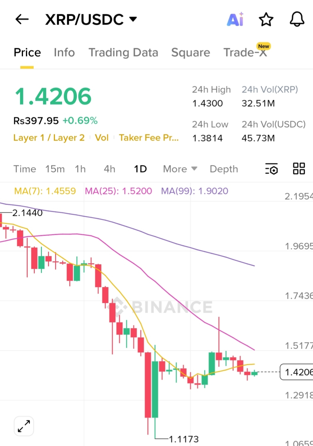 The $XRP /USDC pair is currently trading around 1.4206, showing mild intraday strength (+0.69%), but the broader structure on the 1D timeframe still reflects a dominant downtrend.