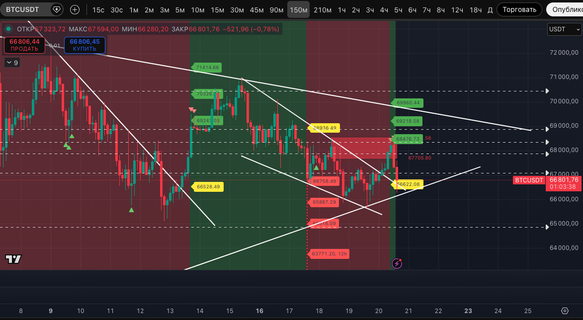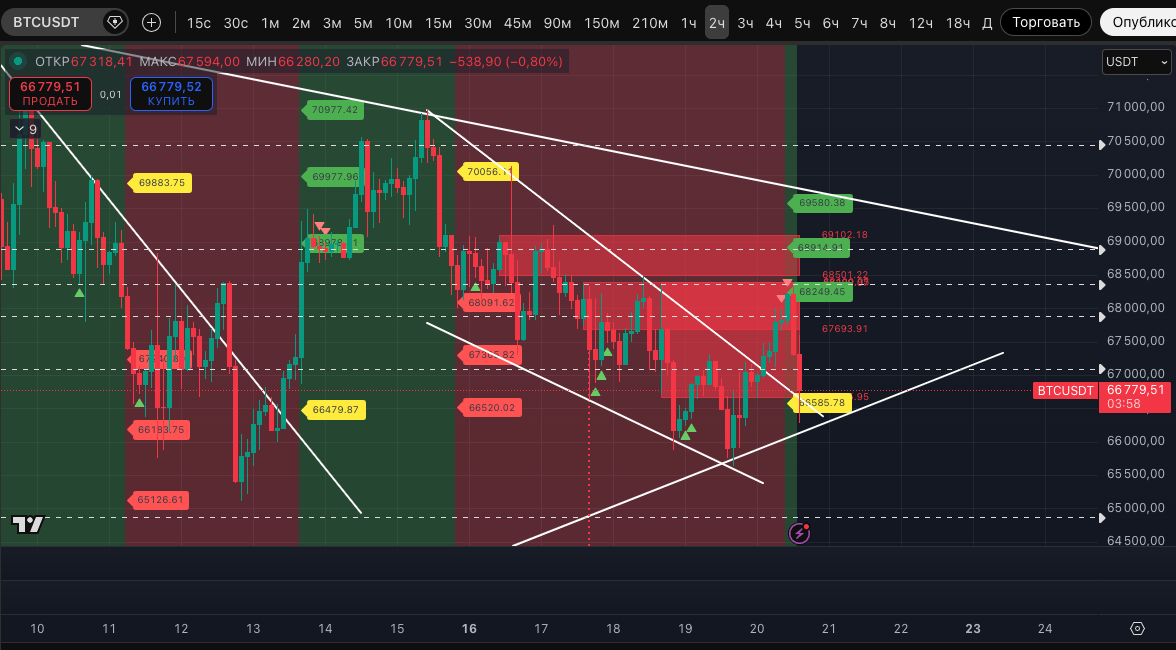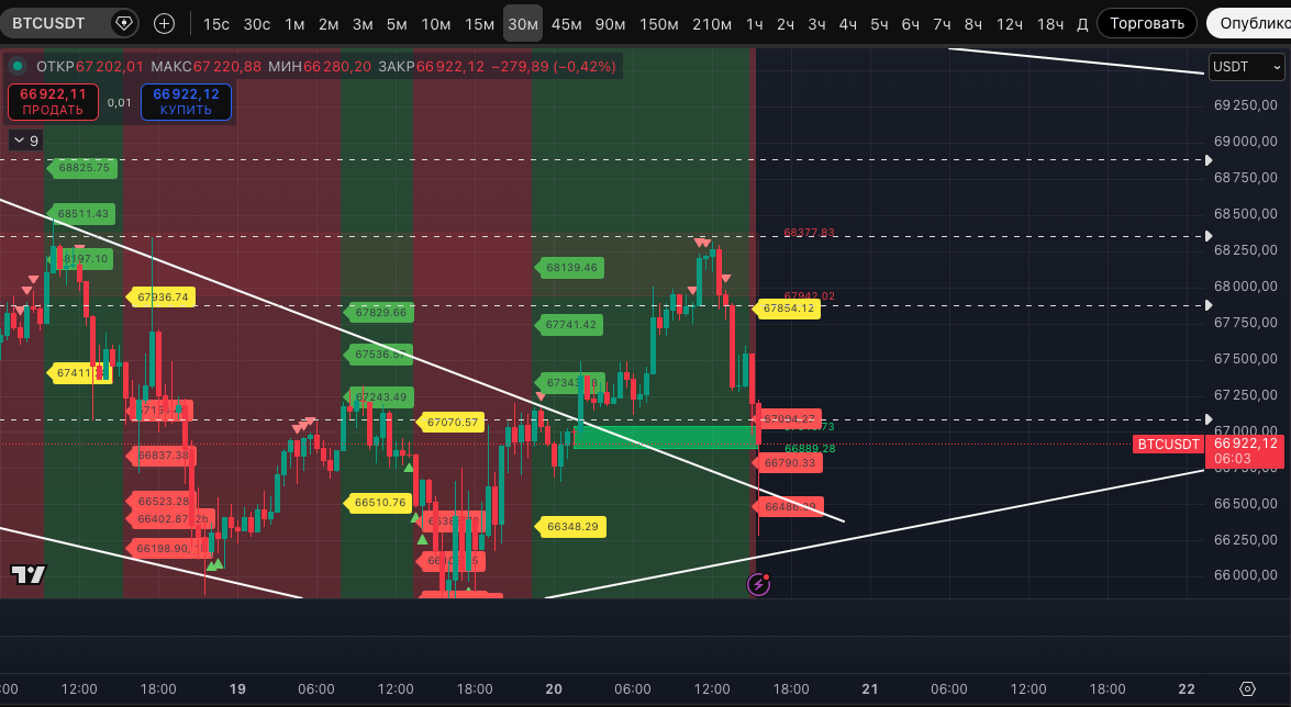 Пока, как видим, #BTC и крипторынок в целом отреагировали снижением. Курс BTC провалился в устойчивый даунтренд уже на 30-минутном ТФ, а пока мы готовили пост - уже и отработал его базовые цели и отскочил от лоя 66 280$.