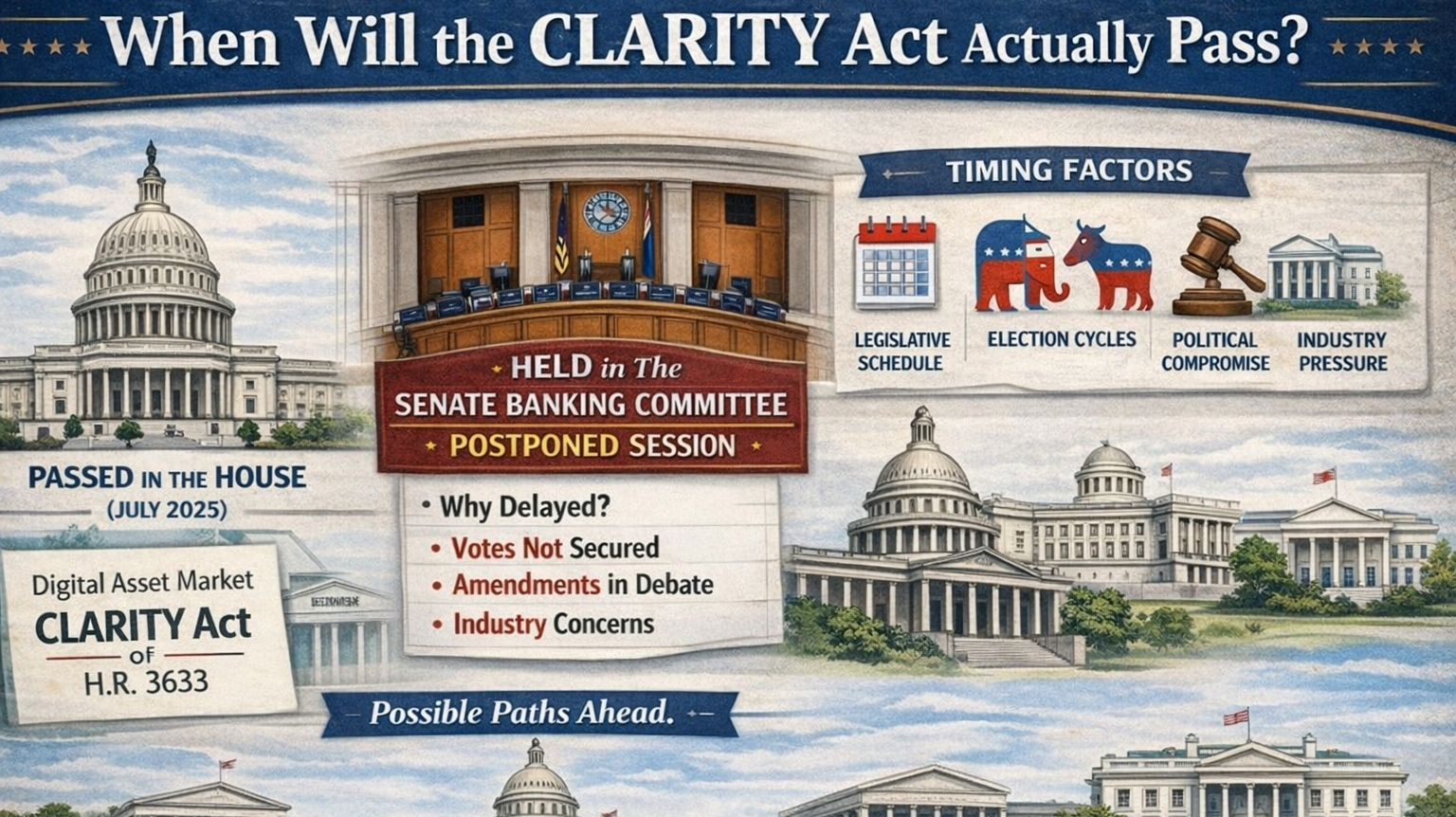 Alcuni osservatori e analisti del settore suggeriscono che il Senato potrebbe potenzialmente approvare un disegno di legge informato su CLARITY entro tarda primavera o inizio estate 2026, se le negoziazioni in commissione vengono risolte presto e il consenso bipartisan viene mantenuto.