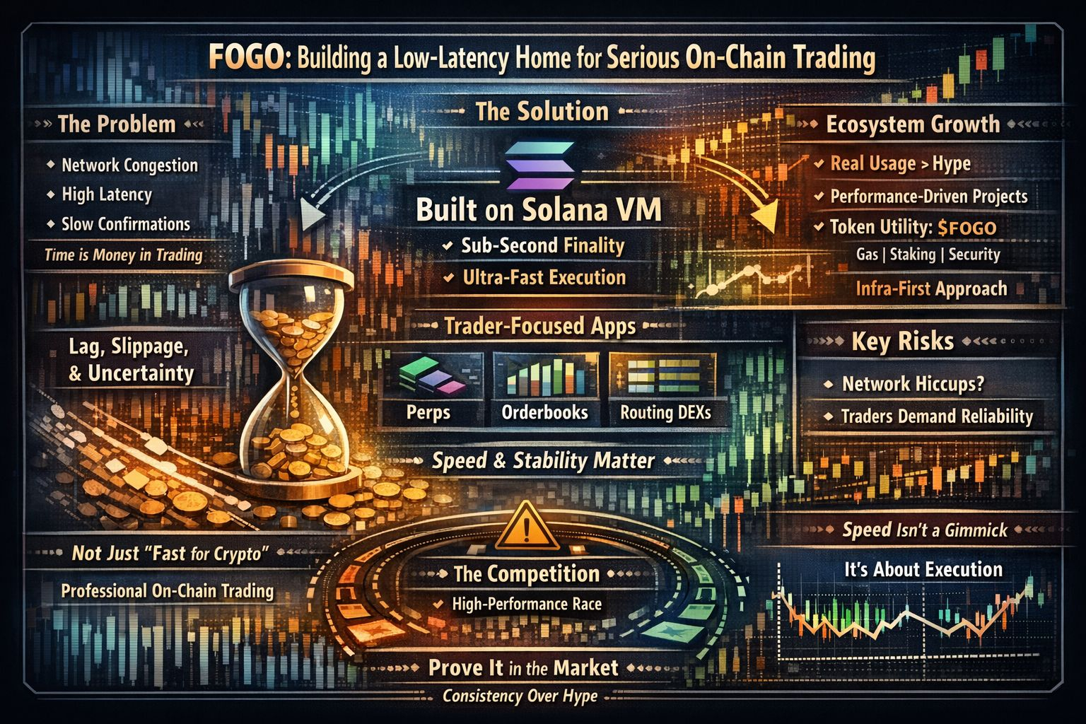 If you’ve traded through a few cycles, you know the feeling. You line up a clean setup, volatility hits, and suddenly confirmations lag, spreads widen, and execution becomes a gamble. We talk a lot about fees in crypto, but time is the hidden cost. Latency, finality delays, network congestion — that’s where real money quietly leaks. Fogo’s entire pitch, as a high-performance L1 built around the Solana Virtual Machine, is aimed directly at that pain point.
