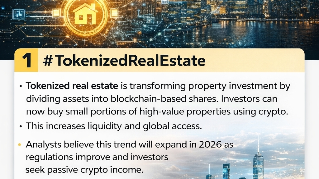 $TOKEN Il mercato immobiliare tokenizzato sta trasformando l'investimento immobiliare dividendo gli asset in azioni basate su blockchain. Gli investitori possono ora acquistare piccole porzioni di proprietà di alto valore utilizzando criptovalute. Questo aumenta la liquidità e l'accesso globale. Gli analisti credono che questa tendenza si espanderà nel 2026 man mano che le regolamentazioni miglioreranno e gli investitori cercheranno reddito passivo in criptovaluta.$TOKEN