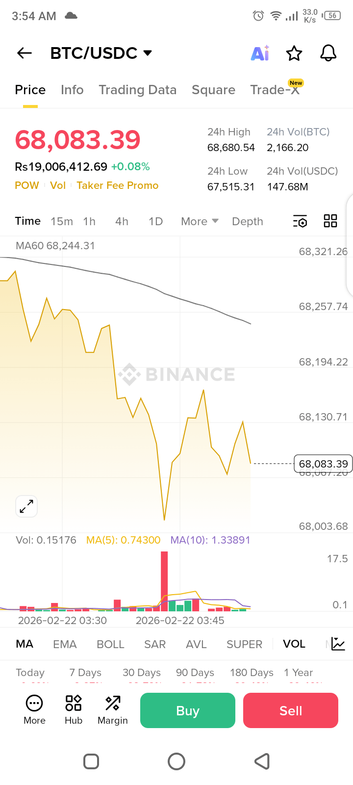 Bitcoin (BTC) is currently trading around $68,000 against USDC, showing signs of short-term weakness on lower timeframes. The chart reveals a sharp drop followed by a small recovery, which suggests high market volatility and uncertainty among traders.
