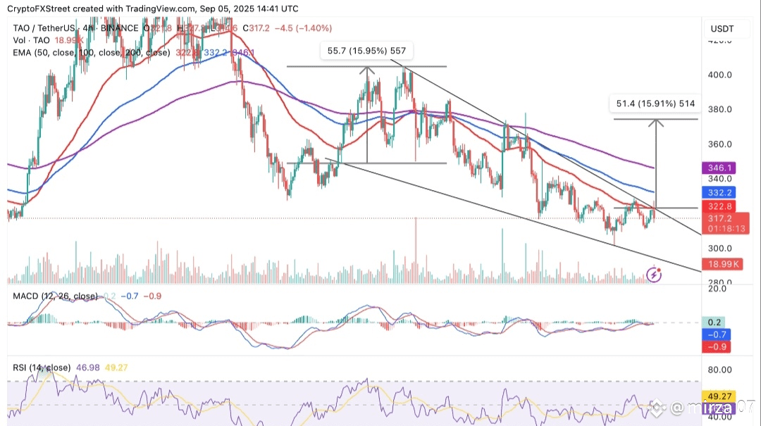 Bittensor punta a un breakout del modello a cuneo del 16% a $375 nel breve termine.