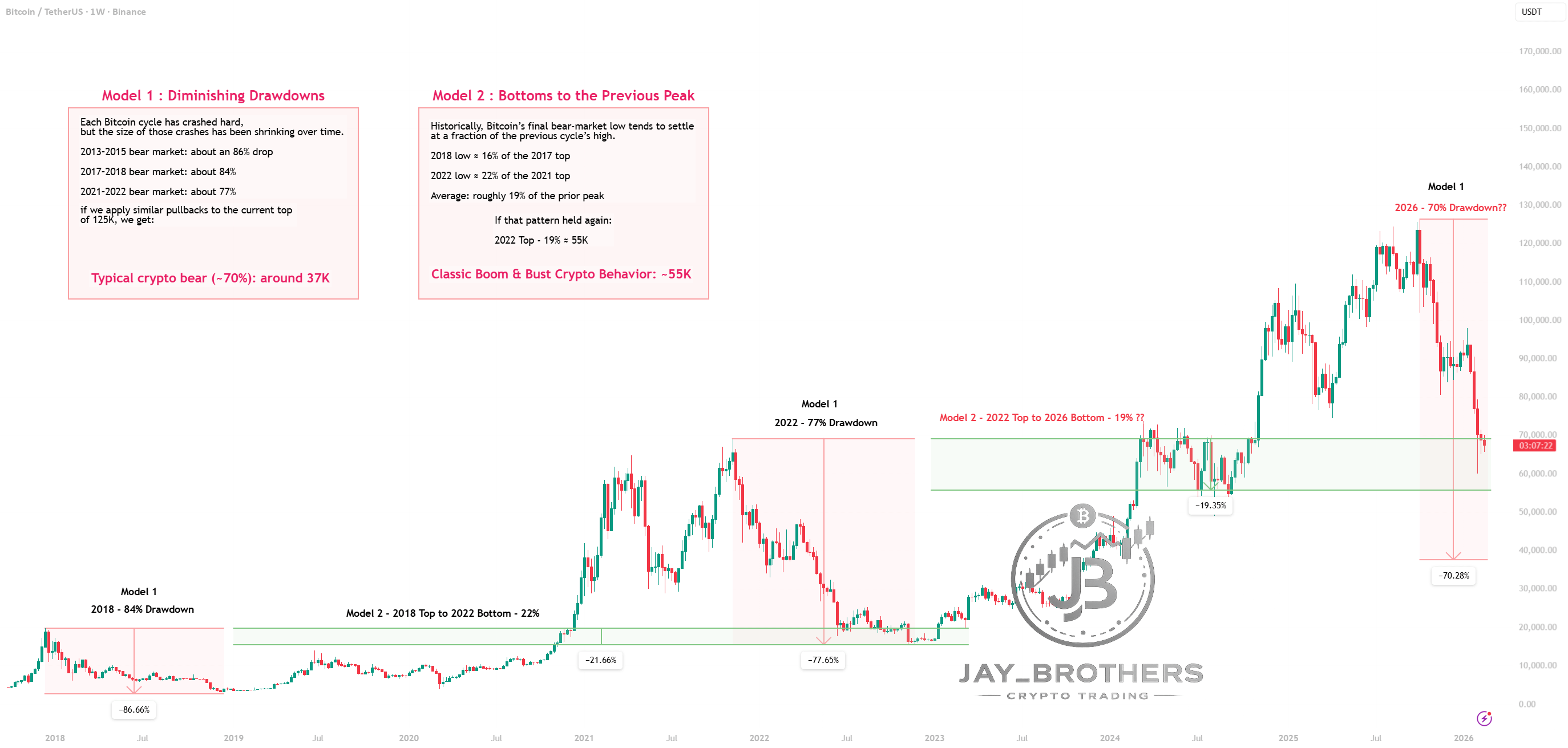 لا يمكن لأحد التنبؤ بالقيعان الدقيقة. استدعاء أدنى مستوى مطلق هو حظ، وليس مهارة. ومع ذلك، يمكننا النظر في كيفية تصرف دورات BTC السابقة لرسم مناطق احتمالية واقعية بدلاً من مجرد طرح أرقام عشوائية.