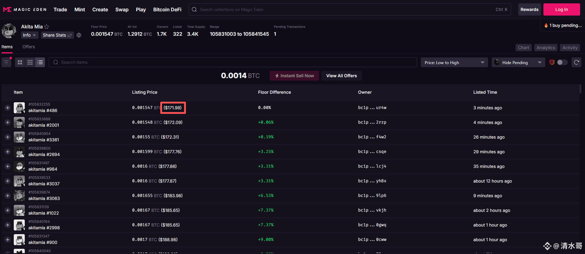 Akito Mia 市场链接:https://magiceden.io/ordinals/marketplace/akitamia?status=%22magic_eden%22