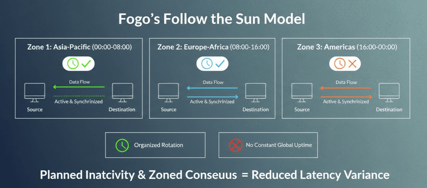 Instead of every validator being awake 24/7 across the globe like caffeinated owls, activity is divided into zones. Regions rotate based on time and trading flow. Participation is structured, not random.