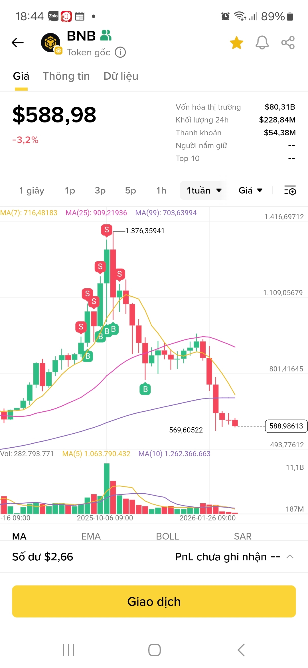 Chúng ta cùng đồng hành trong hành trình chinh phục $BNB với BNB (Binance Coin) là token tiện ích cốt lõi của hệ sinh thái Binance và Binance Chain/BNB Chain, được sử dụng rộng rãi để giảm phí giao dịch, tham gia Launchpad và DeFi. Hiện nay (tháng 2/2026), BNB đang đối mặt với áp lực điều chỉnh kỹ thuật, giao dịch quanh ngưỡng $600-$610, với các tín hiệu kỹ thuật ngắn hạn cho thấy xu hướng giảm hoặc tích lũy, sau khi phá vỡ một số hỗ trợ quan trọng.