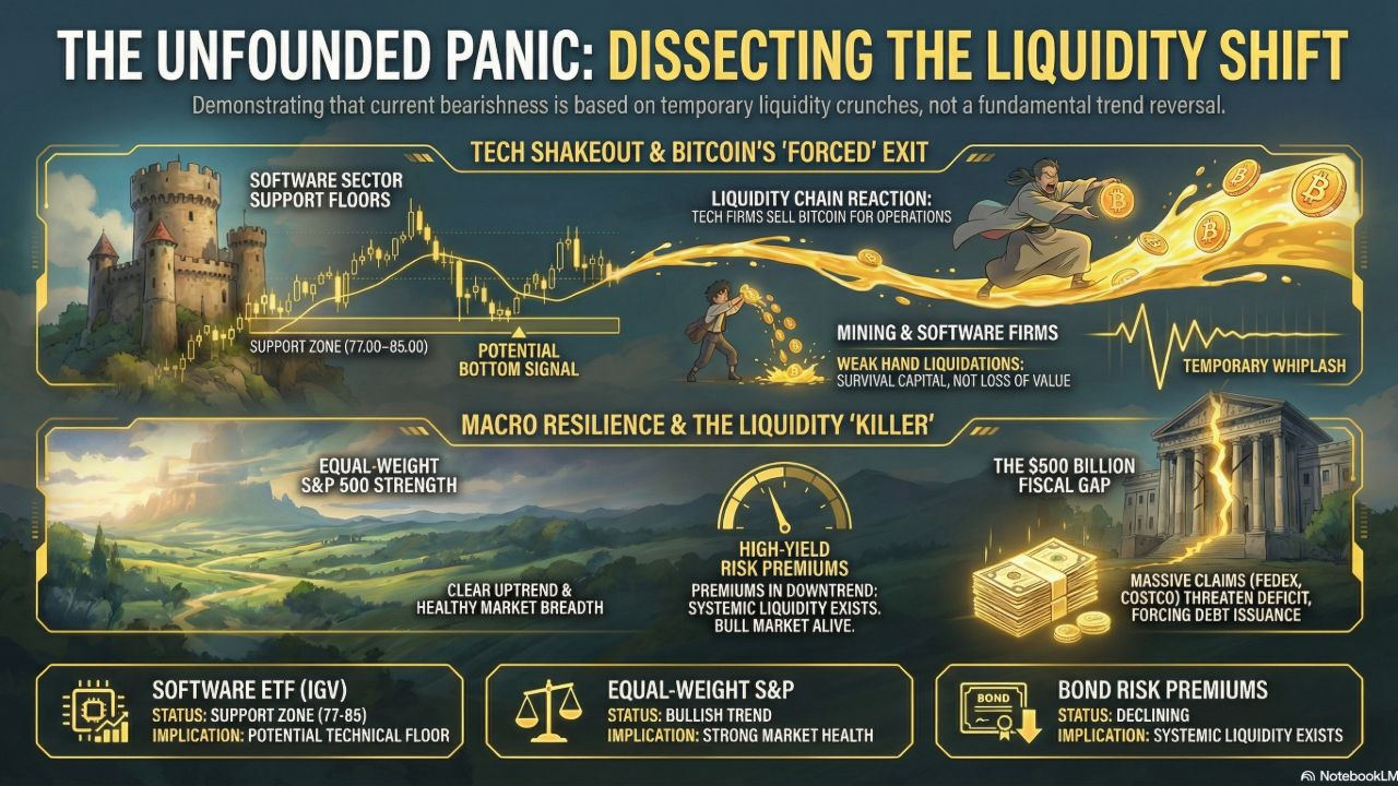 Riflessione personale La mia valutazione è che, mentre il sistema fiscale è effettivamente "rotto"—come dimostrato dal deficit di entrate di $600 miliardi e dalla necessità di un aumento dell'emissione di debito—il principale trend di mercato è ancora sostenuto da una liquidità sufficiente. L'estrema bearishness attualmente circondante il software è una reazione standard a un grande pivot tecnologico, che ricorda i primi giorni della ferrovia o di Internet. Il mio focus strategico rimane fisso sul percorso di minor resistenza: una volta conclusa la fase di vendite forzate e che i partecipanti "asciutti di liquidità" hanno lasciato il mercato, gli attivi di alta qualità riprenderanno probabilmente la loro traiettoria ascendente. In un'era di instabilità fiscale, l'S&P 500 (in generale), l'oro e Bitcoin rimangono le uniche coperture valide contro un sistema di credito in deterioramento. Gli investitori professionali dovrebbero dare priorità ai segnali di liquidità e agli spread di credito rispetto all'attuale ondata di titoli sensazionalistici.