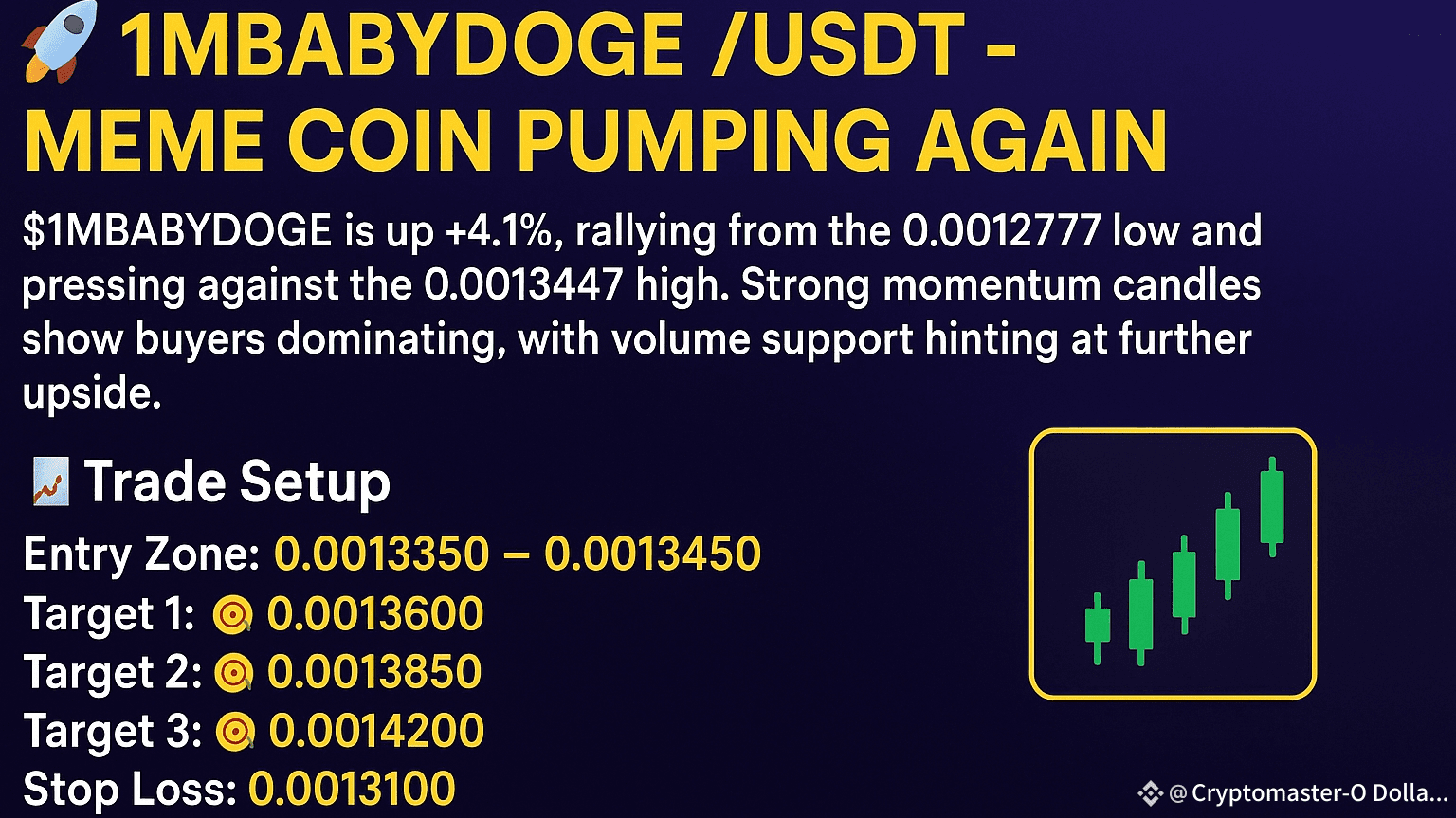 $1MBABYDOGE è in aumento del +4.1%, rimbalzando dal minimo di 0.0012777 e premendo contro il massimo di 0.0013447. Candele di forte slancio mostrano i compratori dominare, con volume che sostiene il movimento e segnala il potenziale per ulteriori rialzi.