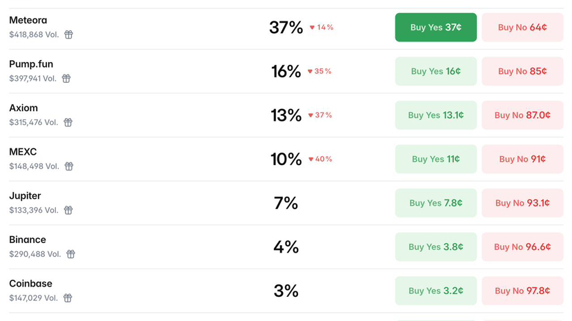 Secondo i dati attuali, la corsa è più accesa che mai con Meteora in testa con quasi il 40% di quota di mercato — un numero che sorprende molti. Subito dietro ci sono Pump.fun, Axiom e MEXC, che occupano rispettivamente il 16%, il 13% e il 10%. Guardando questa classifica, si può vedere che il denaro sta migrando piuttosto fortemente verso nomi emergenti, agili e più in linea con le tendenze di mercato.