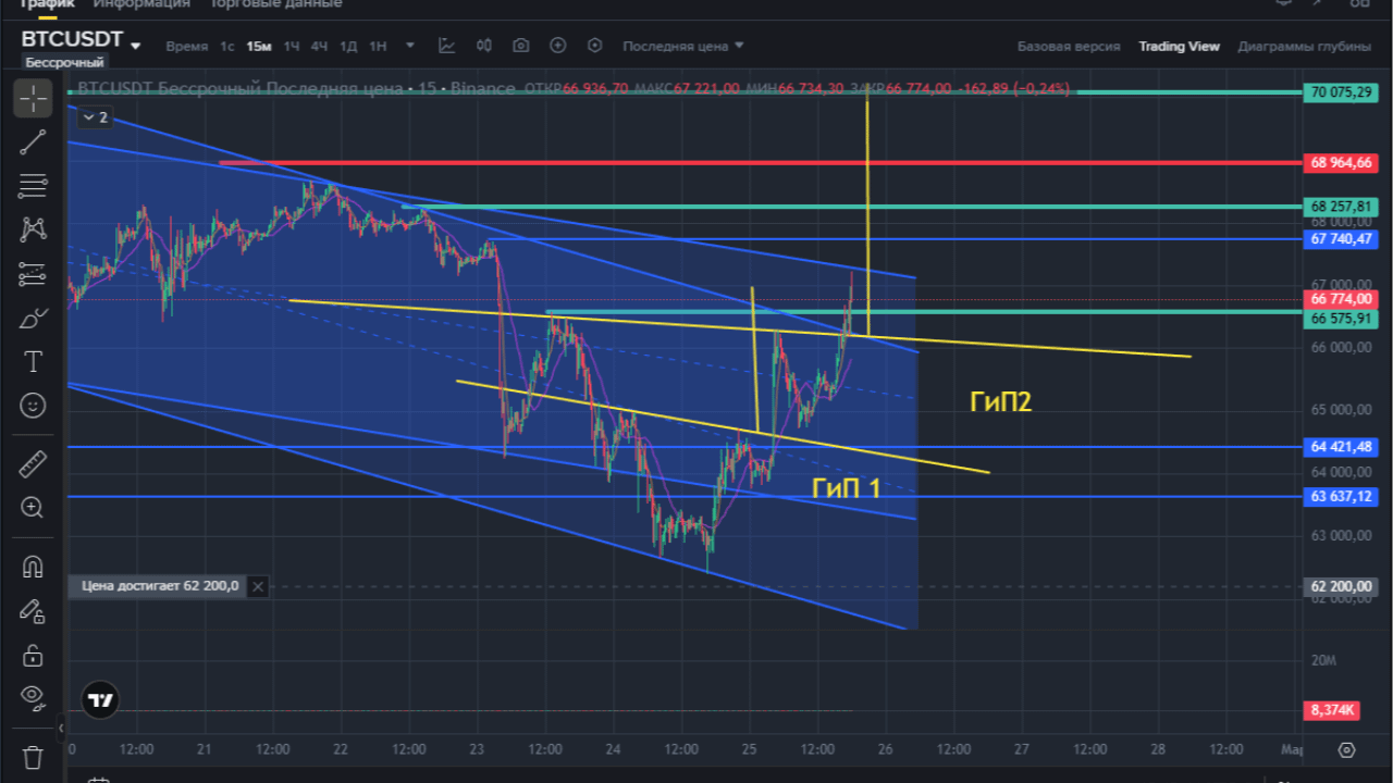 4. Abbiamo rotto non solo la linea del collo, ma anche l'estremo precedente a 66575 (vedi la linea turchese) e siamo usciti dai confini del canale (canale blu), quindi la probabilità che il GiP si realizzi è ancora più alta.