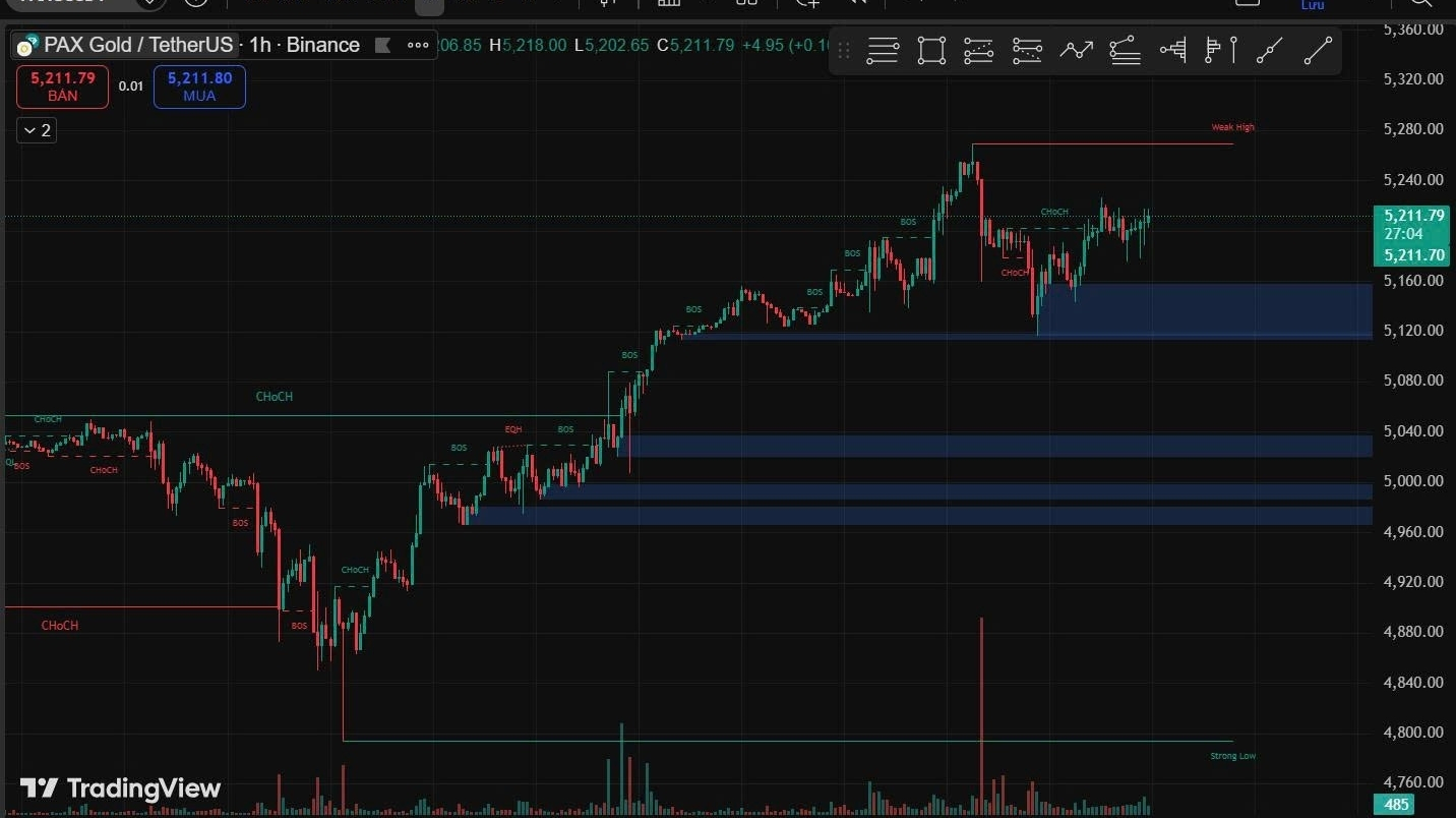 Il prezzo sta oscillando accumulando sotto la zona di Weak High ~ 5,270–5,280.