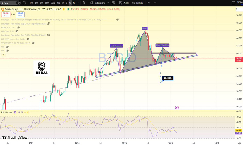 Btc.d holding strong support zone , here i can see a chart 📊 pattern bearish head and shoulders so if this go down we will see alts move