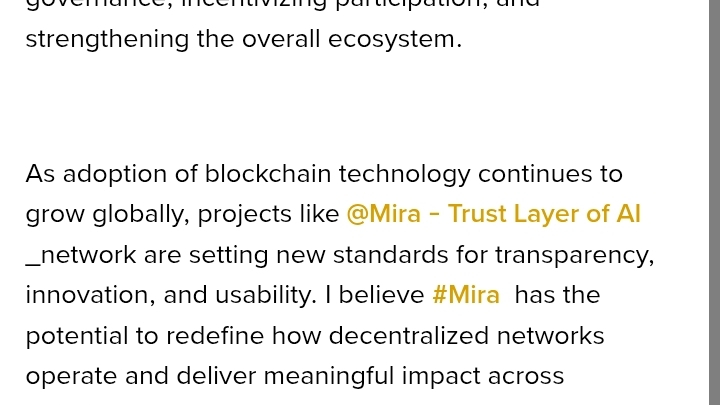Con l'adozione della tecnologia blockchain che continua a crescere a livello globale, progetti come @Mira - Trust Layer of AI _network stanno stabilendo nuovi standard per trasparenza, innovazione e usabilità. Credo che #Mira abbia il potenziale per ridefinire il modo in cui operano le reti decentralizzate e per avere un impatto significativo in vari settori.