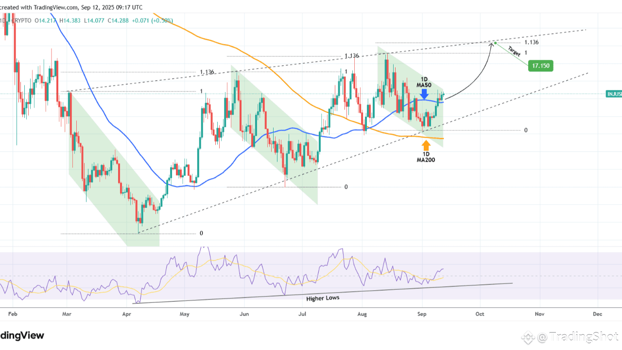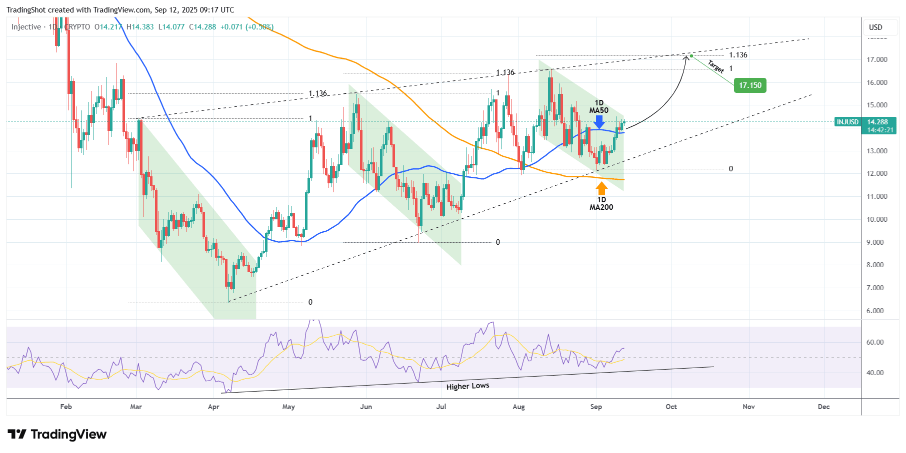 Injective (INJUSD) sta negoziando all'interno di un modello di Cuneo Ascendente sin dal massimo del 02 marzo. Proprio ora ha rotto sopra la sua MA50 a 1 giorno (linea di tendenza blu) di nuovo, seguendo un minimo più alto del 01 settembre sul fondo del modello.