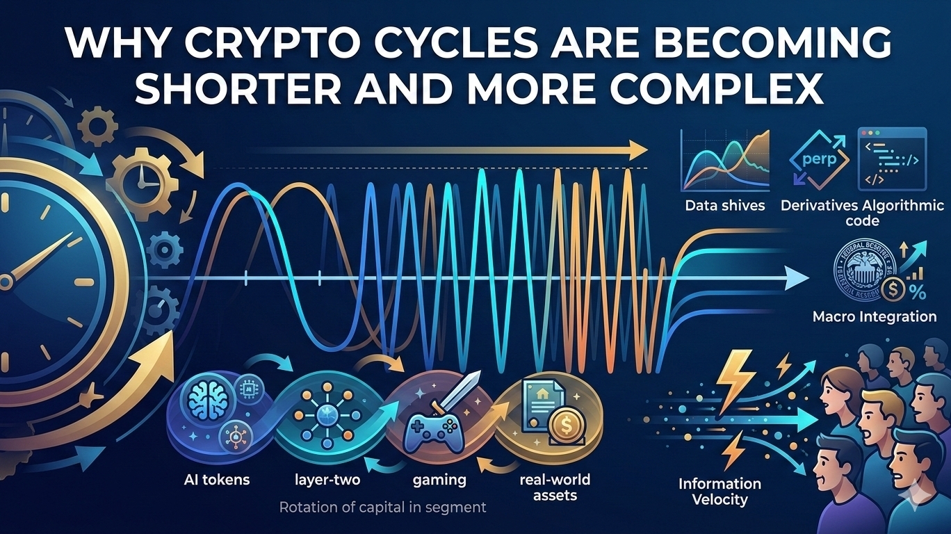 Questo cambiamento è guidato dalla struttura di partecipazione. I cicli iniziali erano dominati dalla speculazione al dettaglio e dai detentori a lungo termine. I cicli moderni includono fondi speculativi, maker di mercato, desk di arbitraggio, trader algoritmici e tesorerie aziendali. Ogni gruppo opera su orizzonti temporali diversi. Le loro interazioni comprimono il ciclo di vita delle tendenze.