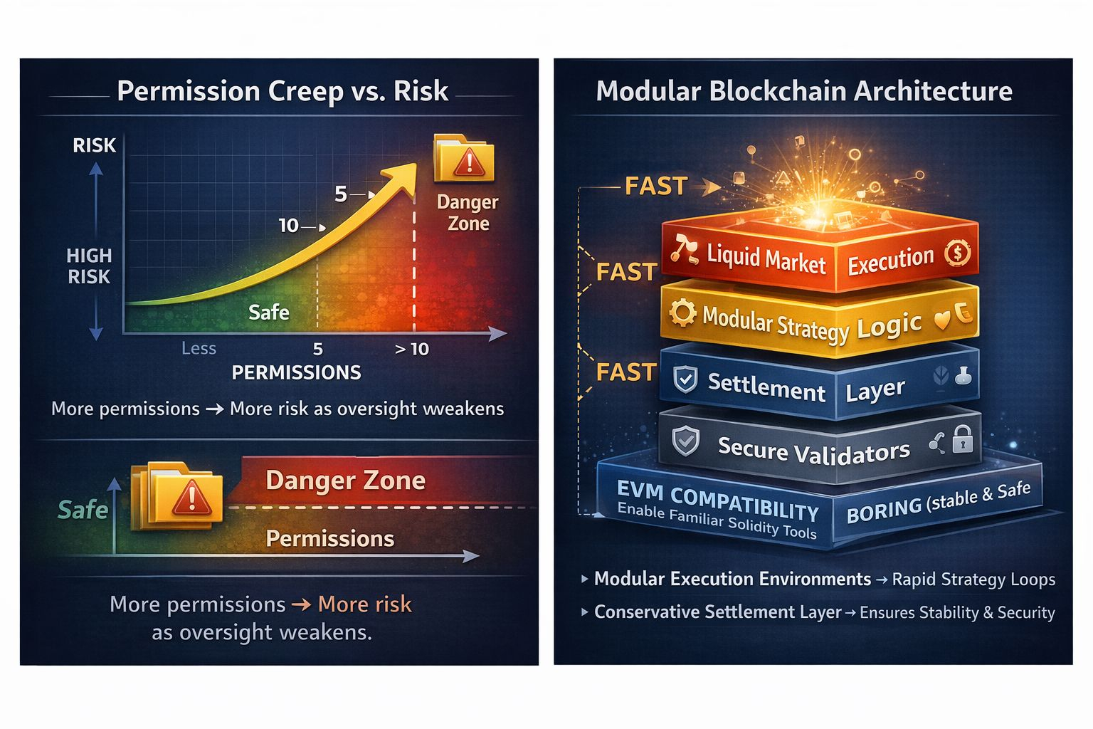 The architecture around it fits the same mindset if you explain it in normal language. Modular execution environments on top of a conservative, boring settlement layer. Let the fast part be fast where it helps—strategy loops, order placement, the constant work of making markets. Let the base layer be boring where it counts—finality, correctness, enforcement. Boring at the bottom is not a lack of ambition. It’s maturity.