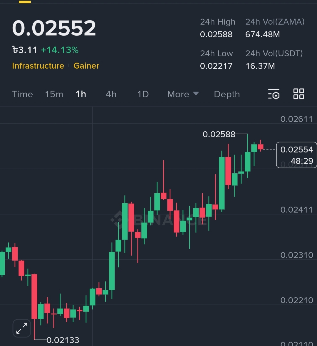Leading the gainers' board with an explosive +15.53% jump, ZAMA is currently priced at $0.02566.
