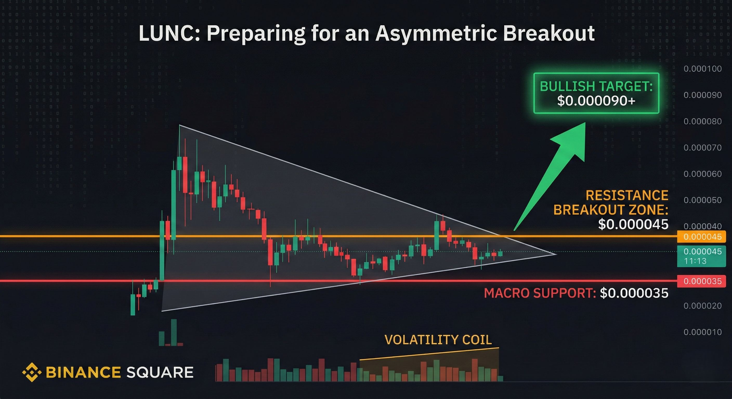 Il Setup: Sul timeframe giornaliero, LUNC si sta comprimendo all'interno di un grande triangolo simmetrico, mantenendo una forte posizione sopra il livello di supporto macro di $0.000035.