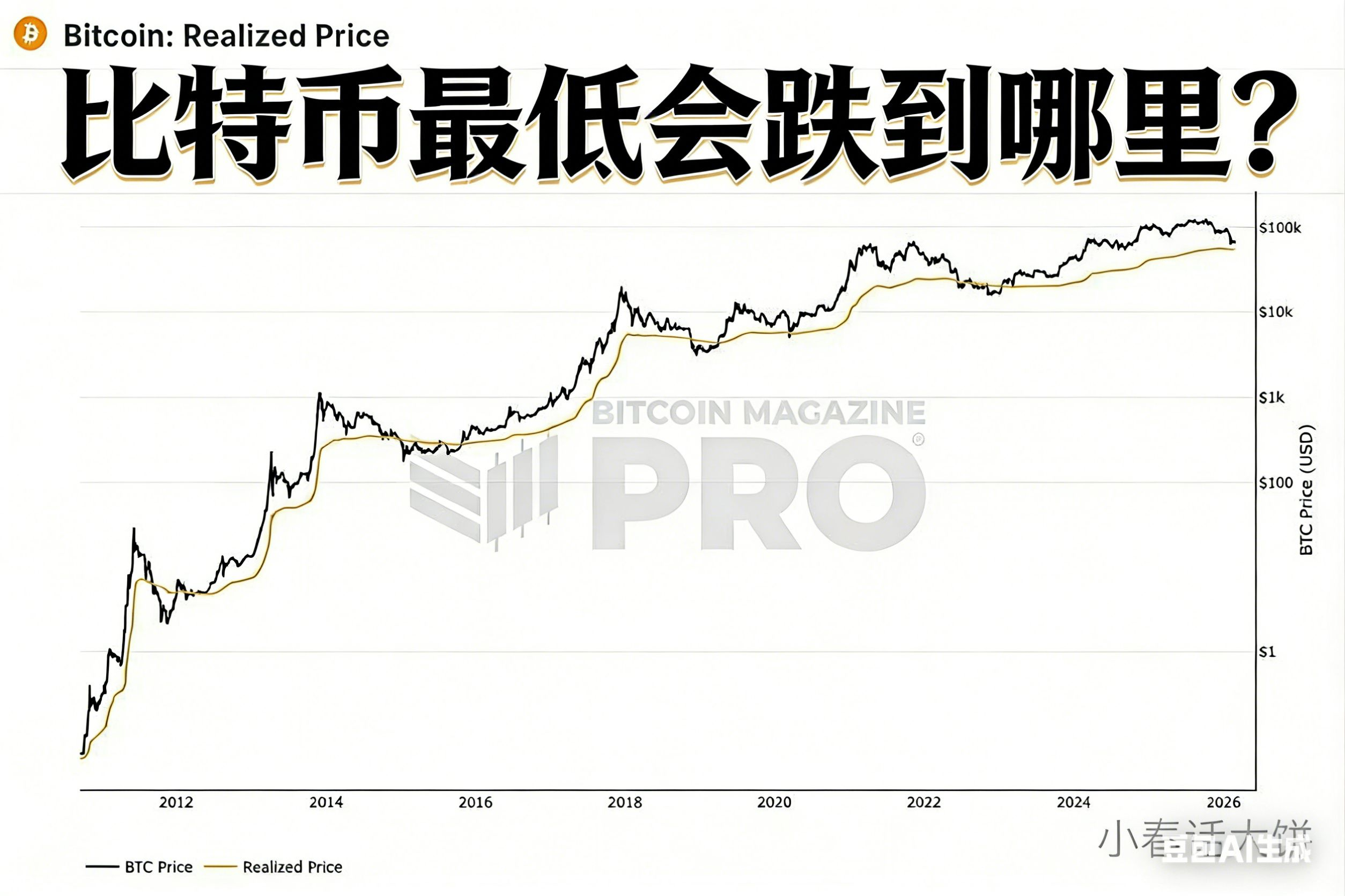 图里黑线是比特币价格,黄线是全网平均成本(Realized Price)。