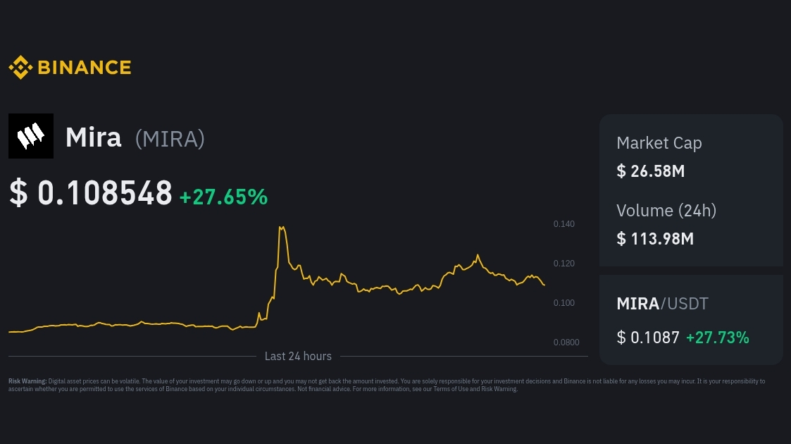 Il $MIRA /USDT ha negoziato vicino a circa $0.09 – $0.10 USDT, mostrando un intervallo relativamente stretto e una volatilità modesta nelle ultime settimane. Questo è coerente con la debolezza più ampia del mercato delle altcoin a febbraio.