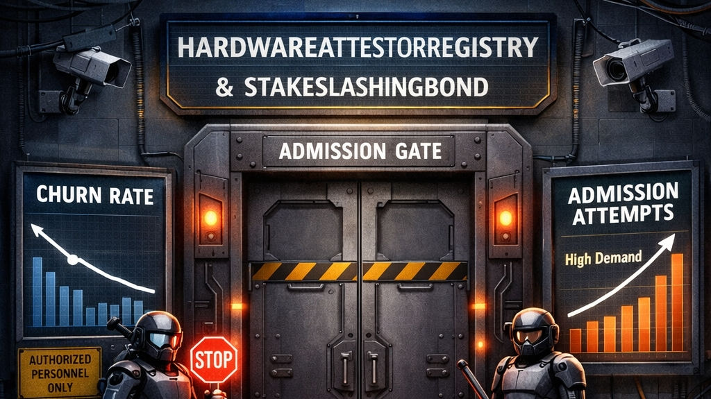 In this design, the biggest idea is not the stamp. It is the door. Admission is the real lever. HardwareAttestorRegistry is the list that decides who is allowed in, and StakeSlashingBond is the money-backed rule that can kick you out or punish you when you fail the required re-attestation window. The network does not just ask, “Are you using approved hardware.” It also asks, “Are you proving it again, on the schedule we demand.” That schedule matters. The constraint is plain. Operators have to show up for periodic re-attestation windows. If you miss the window, you do not just look sloppy. You can be treated as not fit to participate. It is a timed gate, not a one-time badge.
