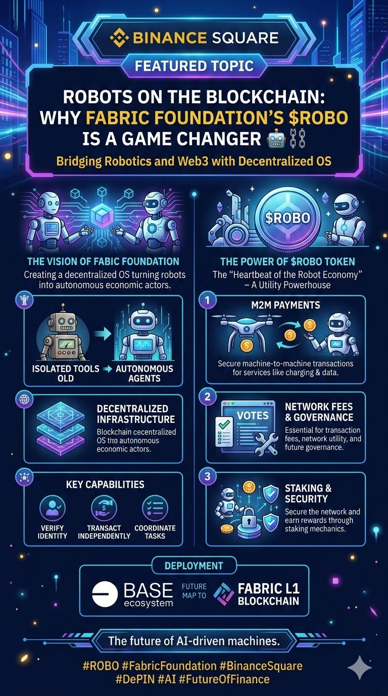 The $ROBO token is the heartbeat of this "Robot Economy." It’s not just a ticker; it's a utility powerhouse used for network fees, machine-to-machine payments, and staking to secure the network. Currently deployed on Base with plans for its own Layer 1, $ROBO is positioning itself as the essential currency for the future of AI-driven m#ROBO #FabricFoundation #BinanceSquare #DePIN N #Aİ achines.