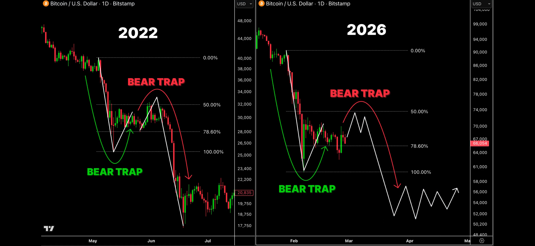 Markets rarely move in a straight line. If we look back at major corrective phases—like the brutal 2022 winter—price action followed a pattern of "stair-stepping." Sharp drops were often followed by convincing-looking recoveries that lured traders back in, only to set a lower high and continue the descent.