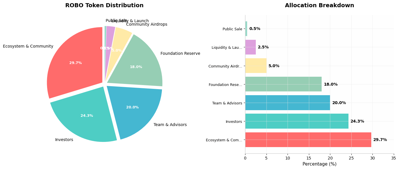 The tokenomics reveal a carefully constructed distribution designed for longevity rather than quick pumps. Total supply is fixed at 10 billion tokens with zero inflation. The largest slice, 29.7 percent, flows to ecosystem and community incentives. These rewards are not handed out for passive holding. They are earned exclusively through verified work, whether that is completing robot tasks, contributing training data, or supplying GPU compute. This design makes robo functionally equivalent to wages rather than investment yield.