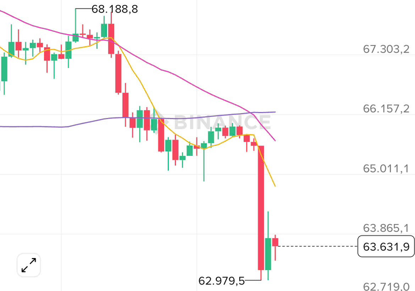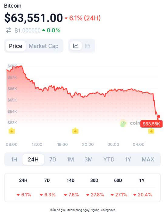 Bitcoin giảm mạnh hơn 6% chỉ trong 24 giờ, rơi về vùng 63.300 USD, xóa sạch toàn bộ thành quả phục hồi trong tuần. Dòng tiền đầu cơ nhanh chóng rút khỏi các tài sản rủi ro khi nhà đầu tư chuyển sang trạng thái phòng thủ.